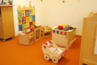 Der Rollenspielbereich enthält wesentliche Elemente eines den Kindern vertrauten Wohnbereiches um sie zum Nachspielen anzuregen. Selbst Erlebtes kann so verarbeitet werden und Rücksichtnahme und Verantwortung im Umgang mit anderen Kindern erlernt werden.