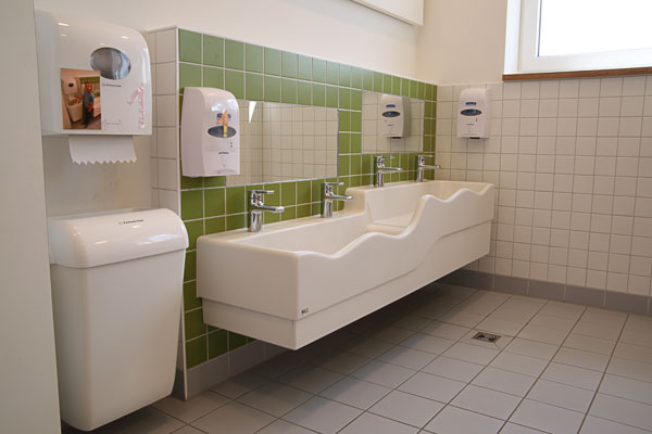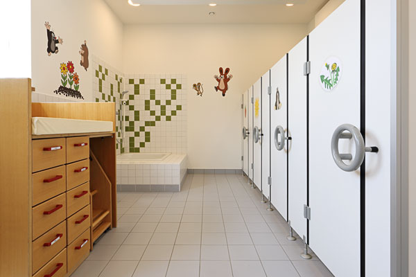Ein geschützter und ansprechend gestalteter Sanitärbereich mit Wickeltisch, Fächer für die Utensilien der Kinder, Kindertoiletten, Handwaschbecken mit Spiegel und eine Lerntoilette stehen zur Verfügung, um diesen wichtigen, intimen, pflegerischen und pädagogischen Vorgang gerecht zu werden.