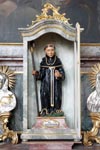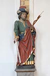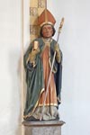 Auf dem rechten Seitenaltar befindet sich eine Figur des Heiligen Leonhard, dem Kirchenpatron. Der Heillige Leonhard, hier als Tonfigur mit Abtstab und Buch ausgeführt, war ursprünglich der Patron der Gefangenen, später auch der Patron des Viehs und der Landwirtschaft und dort im besonderen der Pferde. Seine Geschichte begann im 11. Jahrhundert, wo er als Einsiedler in einem Wald bei Limoges lebte. Ihm werden während seines enthaltsamen, gottesfürchtigen Lebens viele Wunder zugeschrieben.